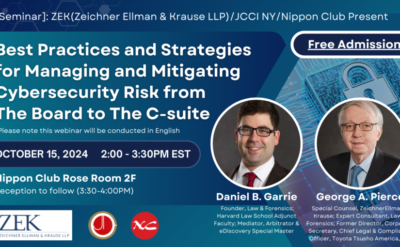 • 【Seminar】ZEK(Zeichner Ellman & Krause LLP)/JCCI NY/Nippon Club Present ”Best Practices and Strategies for Managing and Mitigating Cybersecurity Risk from The Board to The C-suite”