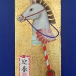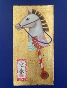 2026年の干支である馬の伝統的玩具、春駒をアクリル絵の具、金箔、和紙を使ってパネルに日本画風に描きます。