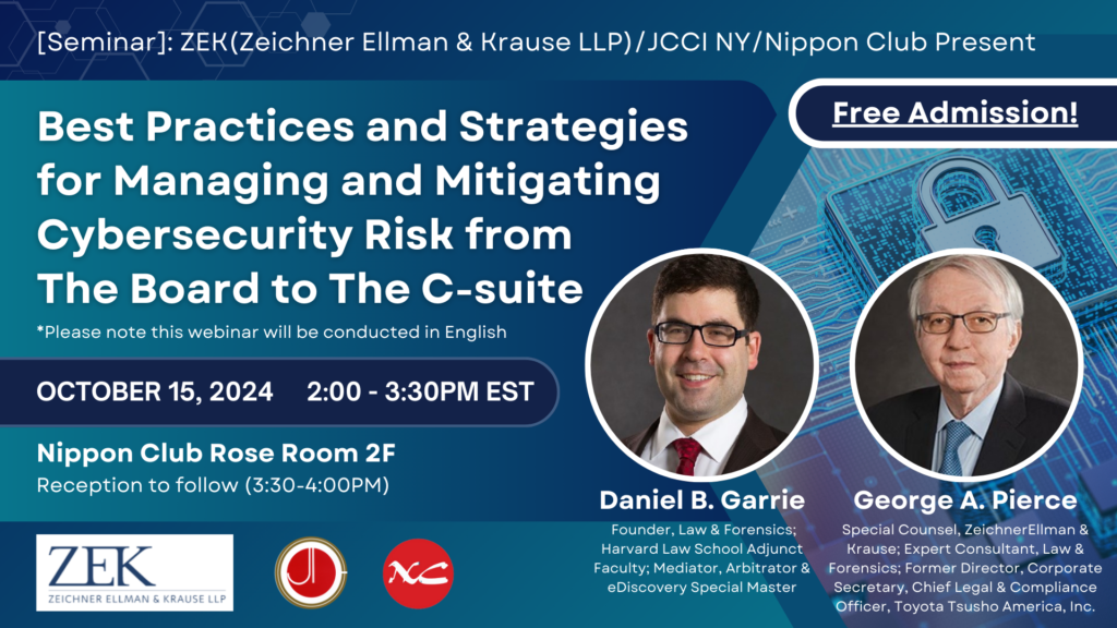 【Seminar】ZEK(Zeichner Ellman & Krause LLP)/JCCI NY/Nippon Club Present ”Best Practices and Strategies for Managing and Mitigating Cybersecurity Risk from The Board to The C-suite”