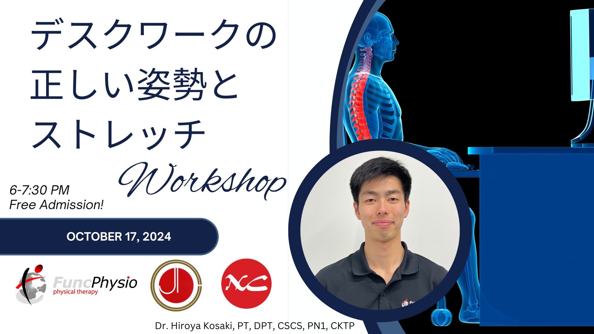 長時間の座り仕事や立ち仕事は、姿勢に気を付けないと、全身の痛みや筋肉の疲労など、長期的な健康問題を引き起こす可能性があります。このワークショップでは、FuncPhysio Physical Therapyの小崎裕也先生が、正しい姿勢、日常的に行える主要なストレッチ方法、そしてオフィスワーカー向けのエルゴノミクスに基づいたエクササイズをご紹介します。体の不調を軽減し、健康を改善し、生産性を向上させるための実践的なテクニックを学ぶことができます。慢性的な痛みに悩んでいる方はもちろん、将来の健康問題を予防したい方にとっても、このワークショップは職場での健康管理に役立つ貴重な機会となります。