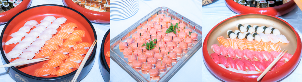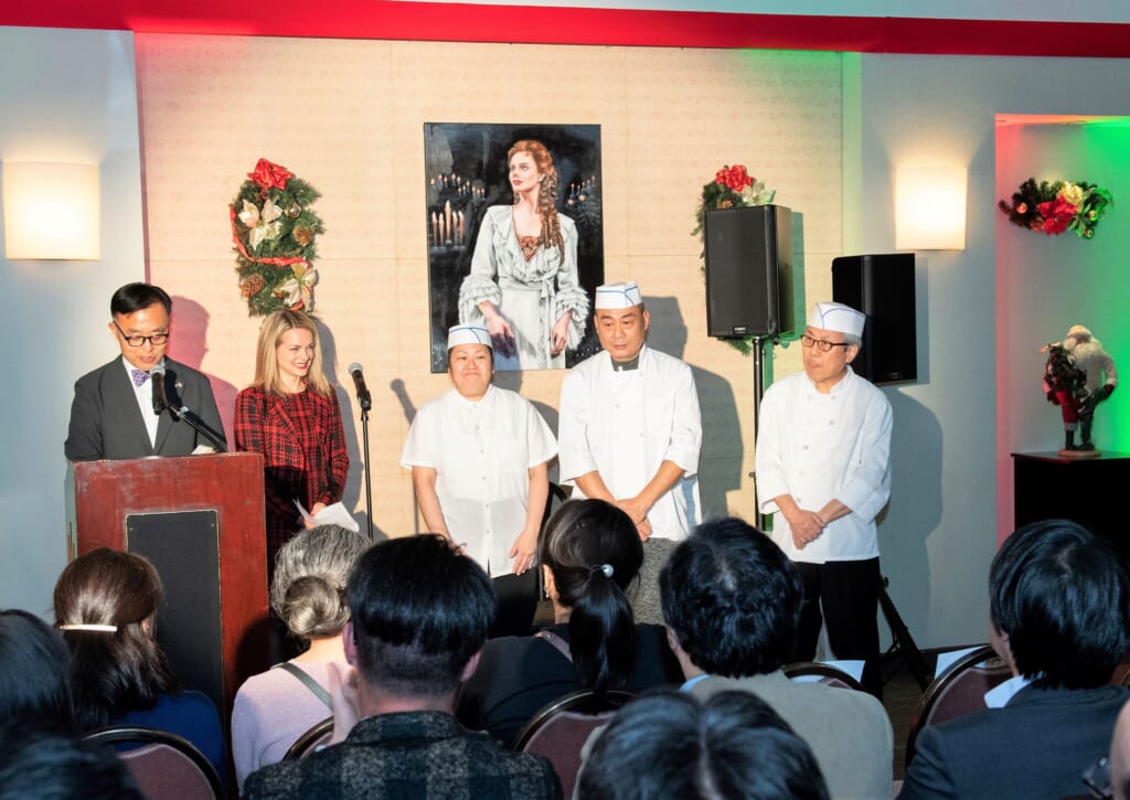 次に、日本クラブのキッチン・スタッフをご紹介させていただきました。パーティーでご提供しましたビュッフェ・ディナーは、鈴木さん、許(きょ)さん、田代さんと、そして杉浦さん、影山さんとで準備いたしました。お客様に美味しいお料理をご提供すること、そしてお客様に気持ちよく過ごして頂くことを意識して、日頃より日本クラブのレストランで腕を振るっています。