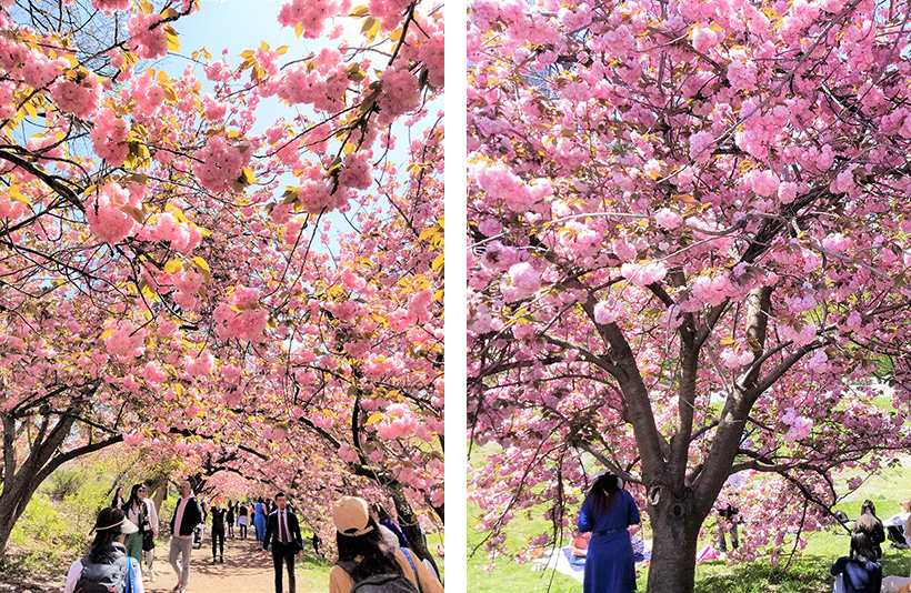 そして、ガイドがセントラルパークをご案内しながらピクニックエリアまで20分程歩いて移動。途中、八重桜が密集して咲くピンクの「桜のトンネル」を通り、満開の八重桜をご鑑賞いただきました。お天気も大変よく、とても綺麗な景色の中、写真撮影もお楽しみいただきました。