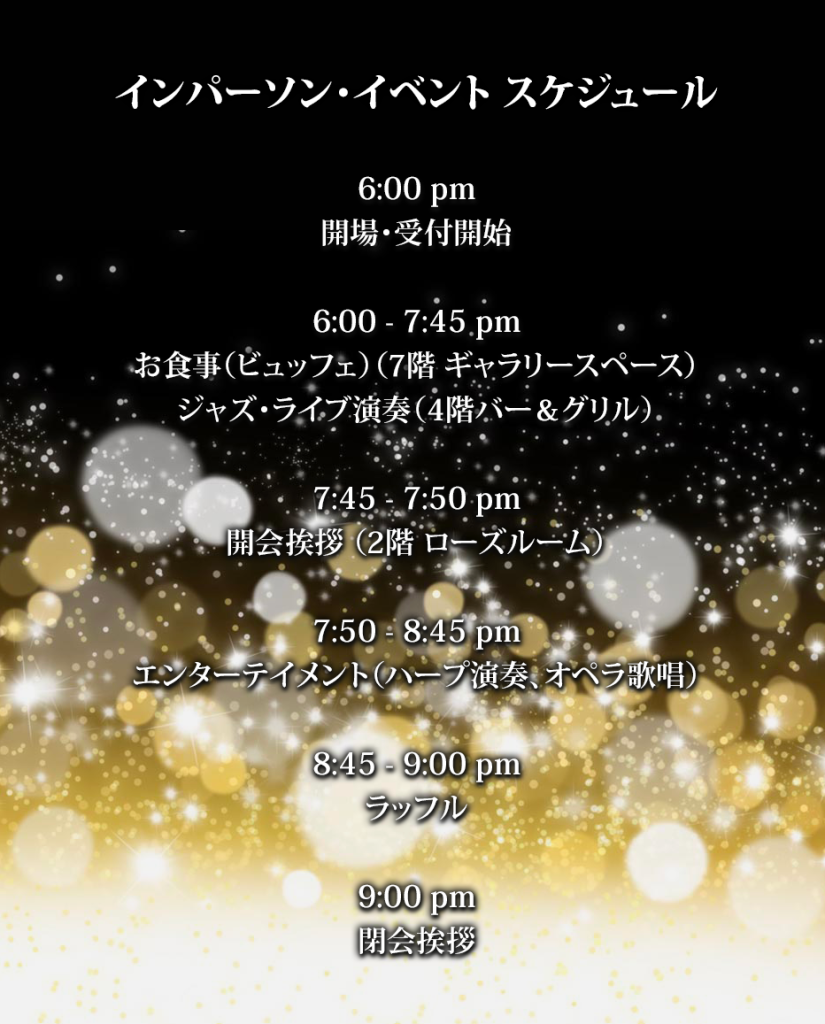 また、インパーソン・イベントでは、会員様同士の交流や、4階バー&グリルでMSM(Manhattan School of Music)のミュージシャン(寺久保エレナ氏:サクソフォン奏者、他)によるジャズ・カルテットの生演奏をお楽しみいただき、イベントの最後にはラッフルプライズも数点ご用意しております。現在参加申込を受け付けておりますので、会員の皆様にぜひご参加いただき、楽しいひと時をお過ごしいただければ幸いです。