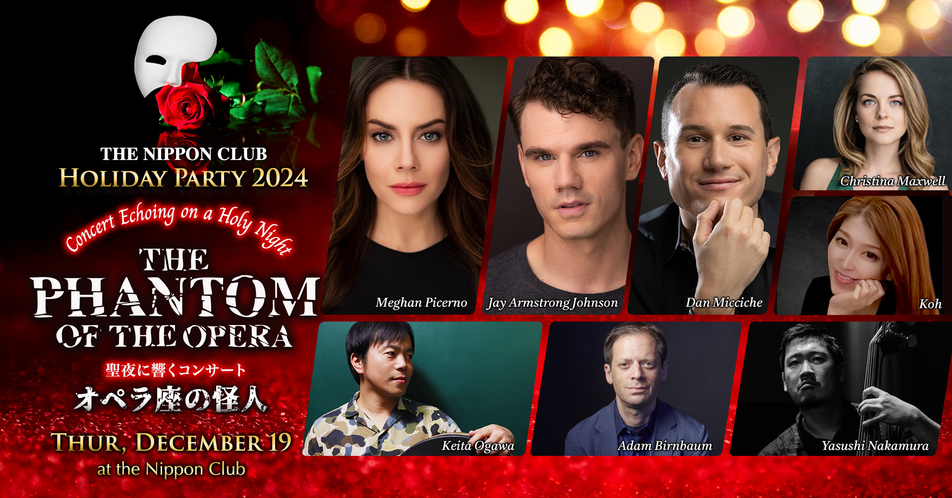 The Nippon Club’s annual holiday party will be held this year on Thursday, December 19, at the Nippon Club Tower. The first half of the event will feature a sumptuous buffet dinner. A Jazz Bar will be open for members to socialize and enjoy live jazz music by Keita Ogawa Jazz Trio. The second half of the event will be an entertainment titled “Holy Night Concert ~The Phantom of the Opera~” featuring the famous songs from the Broadway musical “The Phantom of the Opera” as well as Christmas songs performed by a splendid cast.