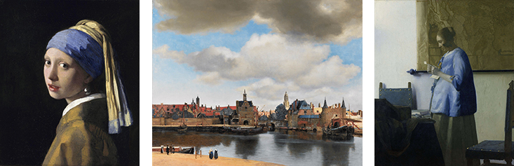 「真珠の耳飾りの女」1665-67 アムステルダム国立美術館蔵 / 「デルフト眺望」1661 or 1658-61 マウリッツハイス美術館蔵 / 「青衣の女」 アムステルダム国立美術館蔵