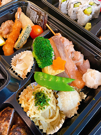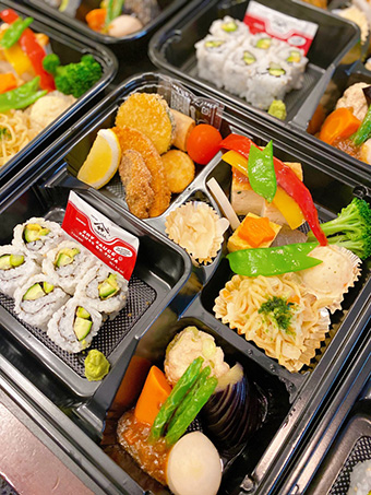 Today’s menu : Grilled Salmon, Chicken Skewers, Egg Omelet, Shrimp Dumpling, Vegetarian Fried Noodles, Konnyaku, Potato Salad, Vinegared Lotus Root,Carrot, Broccoli, Snow Pea, Beef & Pork Hamburger Steak, Potato, Carrot, Green Beans, Assorted Fried food (Chicken, Shrimp, Zucchini, Veggie Spring Roll), Grape Tomato, Lemon, Avocado Cucumber Sushi Roll, Sweet Sour Pickled Ginger Canola Oil, Sugar, Sake, Shiokoji, Mirin, Vinegar, Fish Broth, Demi-Glace Sauce, Japanese BBQ Sauce, Soy Sauce, Salt, Nutmeg, Celery, Black Pepper, Wasabi