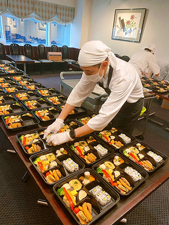 安陵シェフ(左から2番目)とレストランスタッフ。いつもこのメンバーで協力してお弁当を作っています。この日もテキパキと手早く盛り付けて、朝10時前にはお弁当130個分を2箇所の病院に向けて出荷しました。