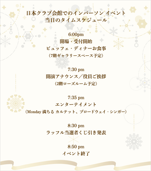 日本クラブでは、年末恒例の日本クラブ・ホリデーパーティを、今年はハイブリッドで開催いたします。インパーソン・イベントをクラブ会館にて12月15日(水)に開催し、同イベントを12月22日~24日までオンラインで配信いたします。インパーソン、またはバーチャルで、一流のエンターテイメントと日本クラブの豪華なお食事をお楽しみください!