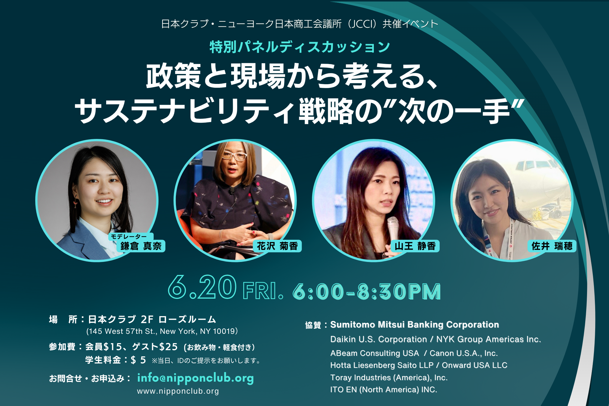 2025年6月20日(金)6:00 PM~8:30 PM(パネルディスカッション・Q&A:6:00~7:15、懇親会:7:15~8:30)
