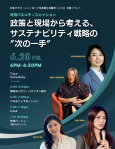サステナビリティ戦略は企業の価値創造において、環境・社会・収益いずれの持続可能性も確保していくための考え方です。米国において、DEI(Diversity(多様性)・Equity(公平性)・Inclusion(包括性))への逆風が顕在化する中、米国の大手ファッションブランドやご自身のスタートアップでサステナビリティ戦略を実践されてきた社会起業家の花沢菊香氏と、直近の環境政策の動向に詳しい、在米国日本大使館一等書記官の山王静香氏をパネリストにお迎えし、今後のサステナビリティ戦略のあるべき方向性についてお話しいただきます。司会進行は、環境省からの派遣でイェール大学環境スクールの修士課程に在籍中の鎌倉真奈(現在JCCI NY/NCでインターンシップ中)が務めます。また、パネルディスカッションの後には、ネットワーキングの時間も設けております。