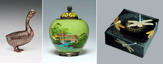 本展では、帝室技芸員の並川靖之による修学院離宮を描いた七宝の香炉(1905)や、人間国宝の二代目前田竹房斎(まえだちくぼうさい)の竹の花籠「輪違文花籃」、漆芸家の岡田紫峰による蒔絵の重箱など、技巧を凝らした珠玉の美術工芸品を展示いたします。また、明治から大正期にかけて東京・浅草で活躍した金工家の長谷川一清(玉東斎)の作品は必見です。玉東斎は、1893年のシカゴ・コロンブス博覧会や1900年のパリ万国博覧会、1905年の リエージュ万国博覧会等に出品するなど日本を代表する金工家として世界での評価 がとても高く、本展では、高い彫金技術で迫真的に表現された鴨の香炉を展示します。更には、印象的な紺碧の青「木村ブルー」で知られる、現代陶芸家の木村芳郎の吸い込まれるようなコバルトブルーから淡い空色に変わるグラデーションの花瓶や、岐阜県重要無形文化財保持者の林正太郎による志野焼の茶碗など、見どころ満載の内容です。