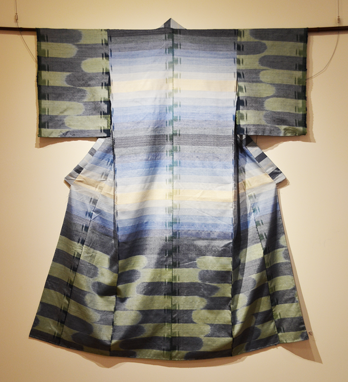 本展では、着物13点を含む、79点の染織作品が展示される予定です。展示される着物は絹糸で、糸から染色して経糸を整えます。その経糸を絣にしぼり、右身頃、左身頃、衽(おくみ)、襟、袖と染め分けをし、機にかけて、手織りで一本一本織り上げた作品です。