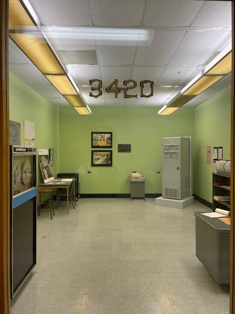 <写真2:3420 Boelter Hall> 近づくと、パッと人感センサーなどで部屋の中の蛍光灯が灯り、よく見えるようになりますから、やはりある程度見学を意識した状態なのでしょう。それほど見つけ出すのに苦労したわけではありませんでしたが、前述したように思わず「あった!あった!」と小躍りしてしまいました。隣接の部屋の研究者や学生にとっては不思議な光景でしたでしょう。