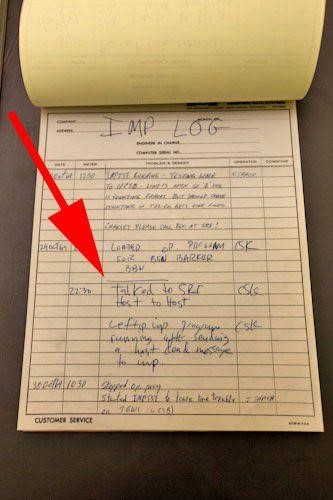 このUCLA の 3420 Boelter Hall は、1969 年 10 月 29 日の夜、今日のインターネットの前身である ARPANET を介してSRIに最初のメッセージが送信された場所なのです。最初の計画は、UCLAのSigma7につながった端末から、SRIのコンピュータにログインさせることでした。そのため、ここのテレタイプからSRIのコンピュータへのメッセージ、「Login:」を送信する予定でした。 研究者たちは、UCLAとSRIの研究室を電話でつないだ状態で、UCLA側からの入力をSRI側でもモニターして確認するという方法でテストをはじめました。完成したばかりのネットワークシステムは最初のL Oの2文字を送信することには成功しましたが、3文字目のGを送信したところでなんとSRIのコンピュータがクラッシュしてしまいました。 したがって、インターネット経由で送信された最初のメッセージは、「LO」でした。 当時このプロジェクトを指導したクラインロック教授は、「これ以上簡潔で、力強く、預言的なメッセージはありませんでした。」とコメントしています。1時間後、チームはリトライして送信に成功しました。その時の通信時の打ち出しなどは一切残っていません。唯一の記録はIMPの作業ログに記された「10月29日22:30 “talked to SRI Host to Host”」です (写真7)。1969 年 12 月までに、さらに2 つのノードがユタ大学、カリフォルニア大学サンタバーバラ校に設置されました。 1975 年までに57 のノードとなり、 1981 年までに 213 になりました。現在、インターネットには500 億以上のノードがあります。この Interface Message Processor が第一号であり、現在でも Boelter Hall 3420 に誇らしげに立っています(UCLAのホームページより)。