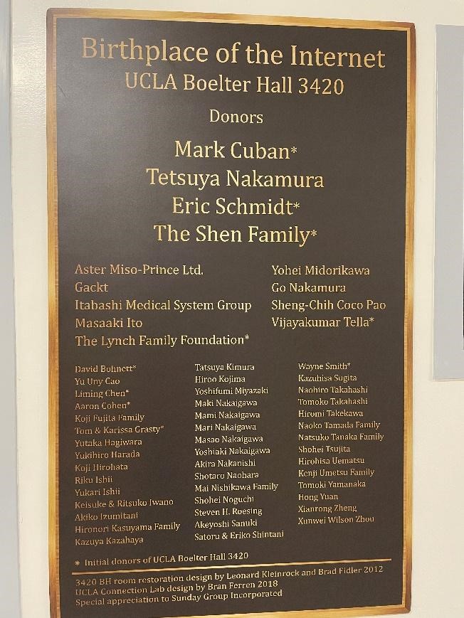 <写真4:古い銘板> Googleの元CEOのエリック・シュミットをはじめ、たくさんの方々がここの保存のために寄付をなさったことが記されています。全く素人の感想で恐縮ですが、日本の方の名前が多いのに驚かされます。その由来など知る由もありませんが、この部屋の隣に設置されているUCLA Connection Labの関係者の方々も多いと推察されます。