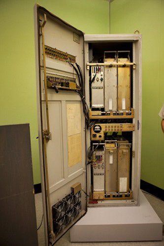 <写真6:IMPの中身> ただ、今日の商用インターネットを初期から支え、現在も利用されているCisco Systems社のルーターは、ARPANETに接続するスタンフォード大学のキャンパスネットワークで利用されていたBlue boxと呼ばれる装置と、その上で動作するソフトウェアが元のようですから、写真のIMPと機能は似ていますが、別モノです。