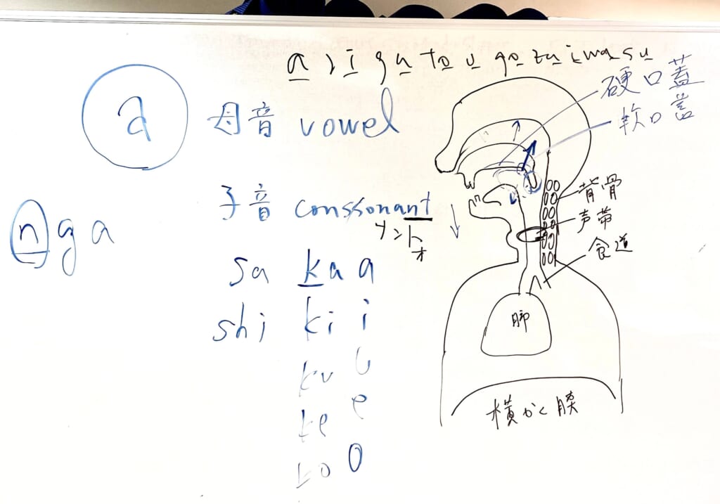 <発声練習時に伊藤がホワイトボードに描いた図解。左側では日本語の美しい発音について解説しています。>