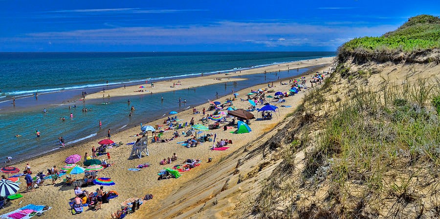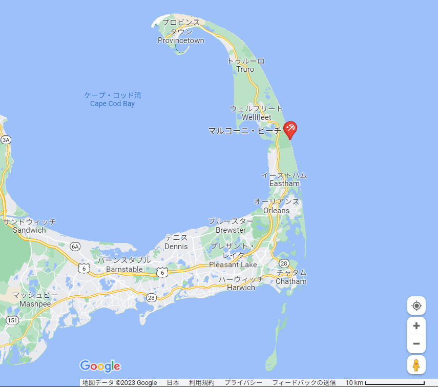 ケープコッドは地図を見ていただくとわかると思いますが、ちょうど人が腕を曲げて力こぶを作ったような形をしています(図1)。真ん中を通るRoute 6 を行くと、腕を曲げた肘の少し上あたりに当たるところにマルコーニ・ビーチがあります。このあたりは白砂のビーチが広がっています。外海で特に波を遮るものもないので、打ち寄せる波は割と強く、大人でも波が引くときは沖へ引っ張り込まれそうになる感じがあり、小さい子が一人で海水浴という感じではありません。海辺での夏の日差しを楽しむ。海岸で遊ぶ。そういう風景があちこちで見られます。