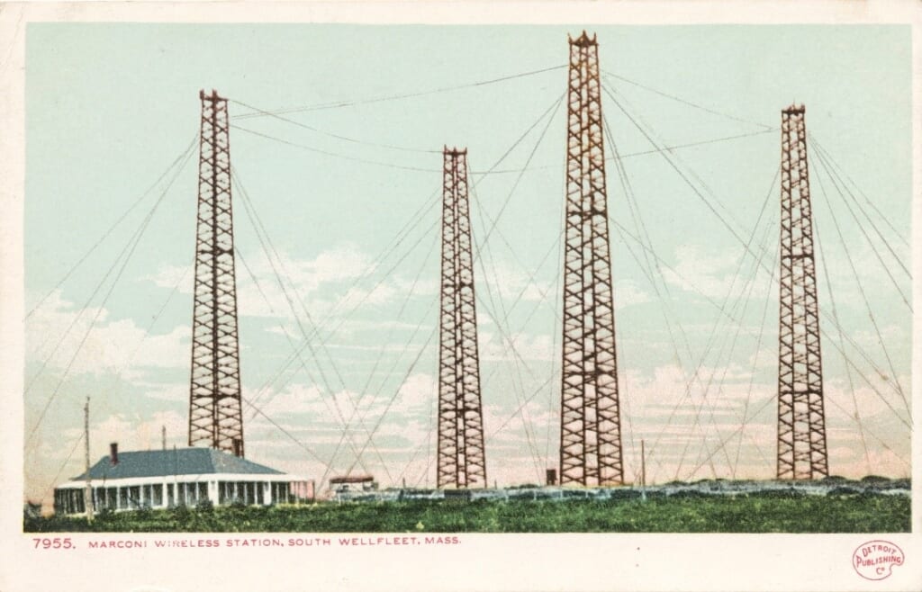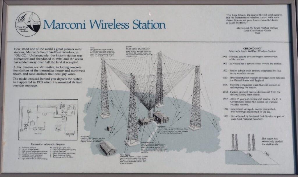 初の大西洋横断の無線通信は、1902 年 12 月 17 日にカナダのノバスコシア州グレース ベイで双方向メッセージが送受信されました。ここ、 ウェルフリート・サイトの準備が整い、1903 年 1 月 18 日にマルコーニは米国大統領と英国国王の間でメッセージを伝達することに成功し、またも世界初の (そしてちょっとしたメディアイベントのような) イベントを開催しました。 その後、技術の急速な進歩により、この無線局はあっという間に時代遅れになり、マサチューセッツ州チャタムの新しい無線局に取って代わられるのです。現在はタワーや局舎というものは存在せず、わずかに当時の局舎の壁やレンガが残置されているにすぎません。
