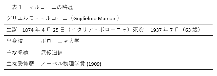 ここで、マルコーニについて簡単に触れておきましょう(表1)。