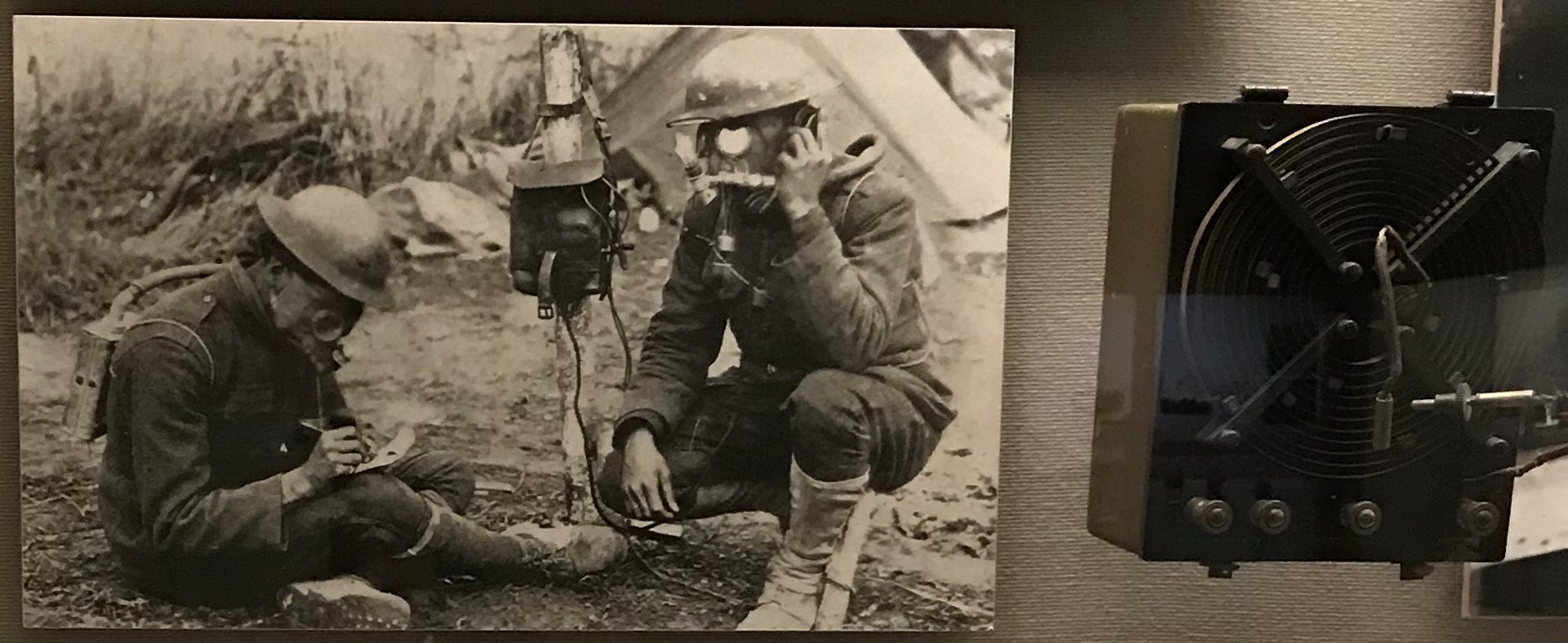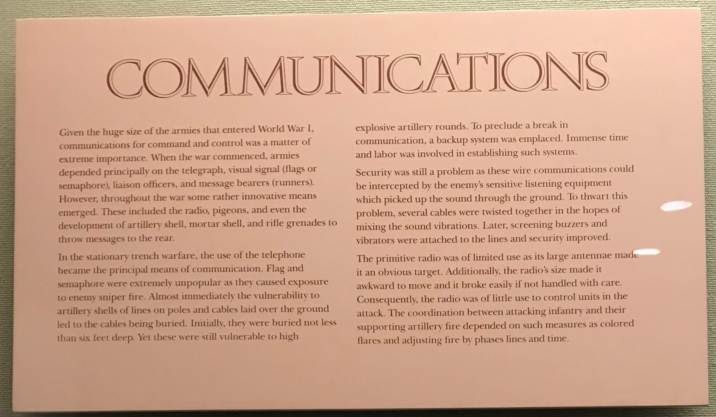 冒頭の説明によると、第1次大戦では軍の部隊は大きくなり,その相互の指揮命令系統(すなわち通信)は大変重要な機能とされていました。通信としては主に電信が利用され、視覚による通信(手旗信号)やメッセージの伝達(人間による配達)は徐々に姿を消していきました。第一次世界大戦での塹壕内の通信は主に無線や有線電話といった革新的な手段が取り入れられました。一方,有線通信は敵軍による盗聴の問題が常に付きまとったようです。無線は当初は大きなアンテナであり破損しやすい装置でしたので,陸軍では戦闘の指揮命令に本格的に取り入れられるには少し時間を要したようです.