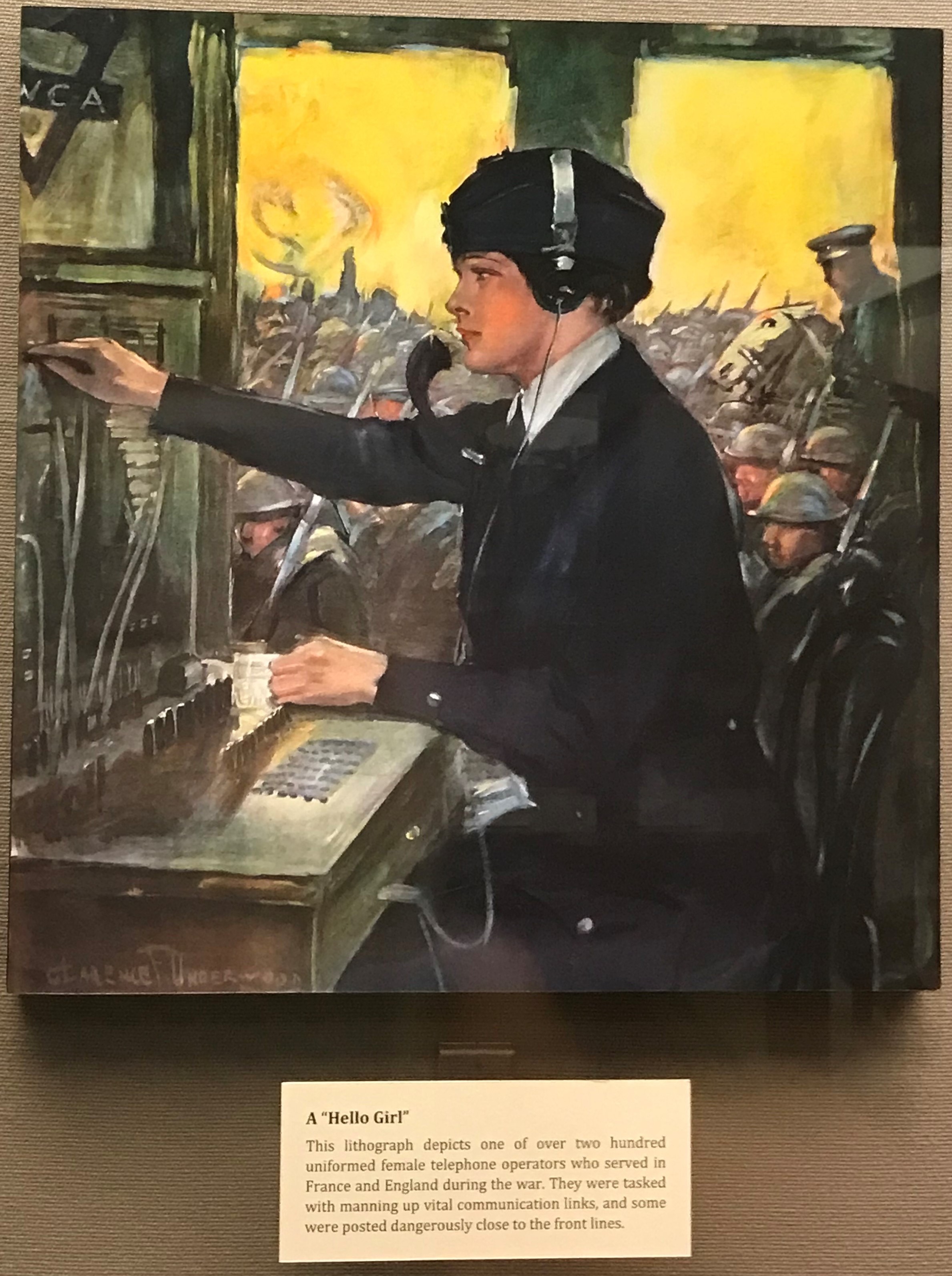 第二次世界大戦の際、制服を着用した女性の電話交換手を描いたリトグラフの絵画です。イギリスおよびフランスで活躍したということですが、当時は200人以上の女性電話交換手がいて、前線に近い危険な場所でも勇敢に従事していたそうです。