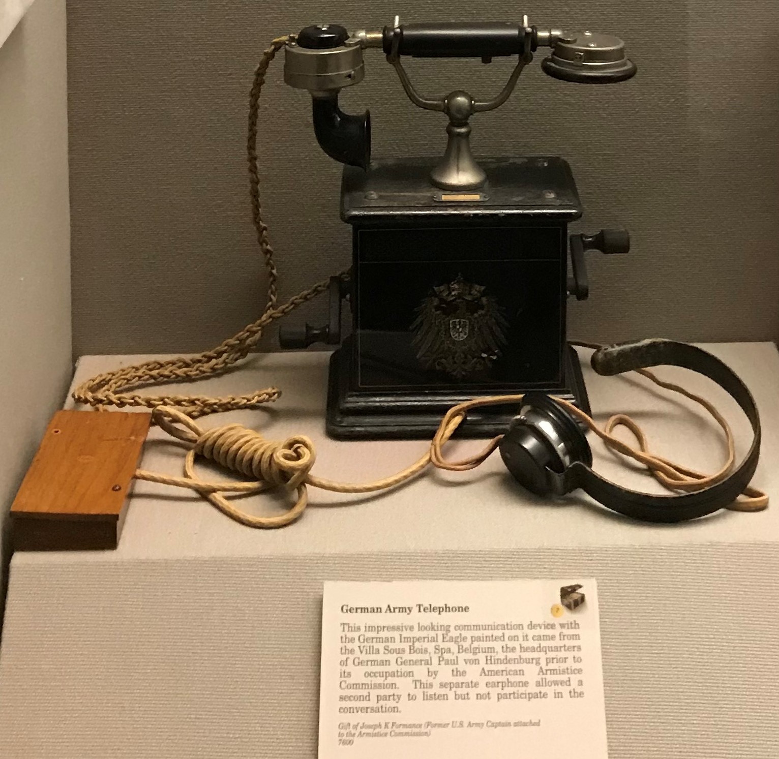 この一風変わった電話機はベルギーへの米軍の進撃の後に押収されたもので、実際にドイツ軍のヘッドクォーターで使用されていたものです。通常の電話機に第三者が傍聴できるヘッドセットが付いています。第三者は会話に参加できないので記録要員がメモを取るような用途に使ったのだろうと思われます。