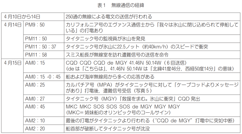 出典:http://www.astrosurf.com/luxorion/qsl-ham-history-titanic.htmここで、タイタニック号の氷山への衝突から沈没までの無線通信の経緯(通信ログ)を見てみましょう。