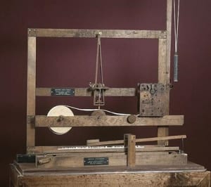 モールスの発明から15年経ったころの改良されたデザイン。電磁石につけたペンが動くロール紙に受信したドットとダッシュを描画する構造は変わらない。
