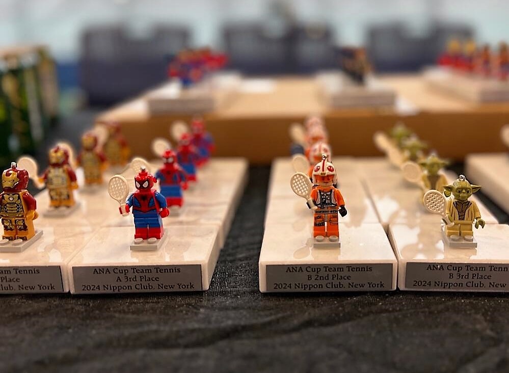 The March Tennis Tournament, the last of the season, was a team competition, with a total of 31 teams and 138 players participating in the Open A, Open B, and Women’s events, where fierce competition unfolded. The top place winners in each event received a trophy made of a popular LEGO figure and a wonderful prize from All Nippon Airways, the title sponsor of the event. In the extra naming contest, the top teams received prizes from sponsors ITO EN North America and Minamoto Kitchoan.
